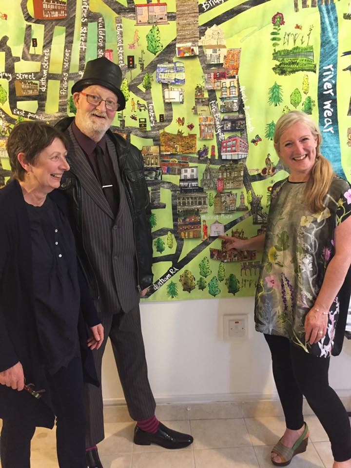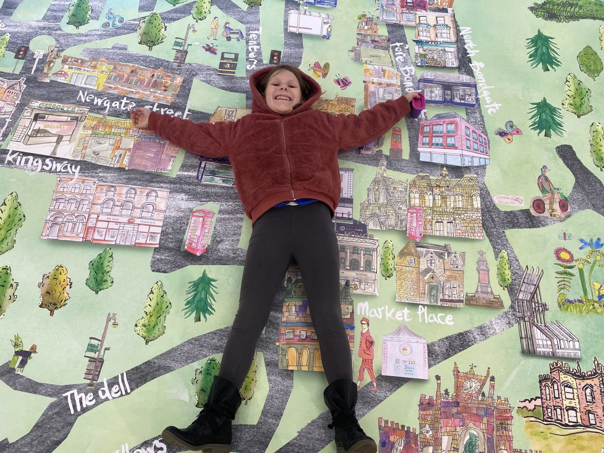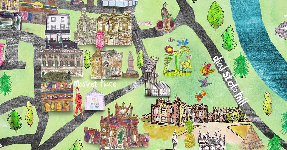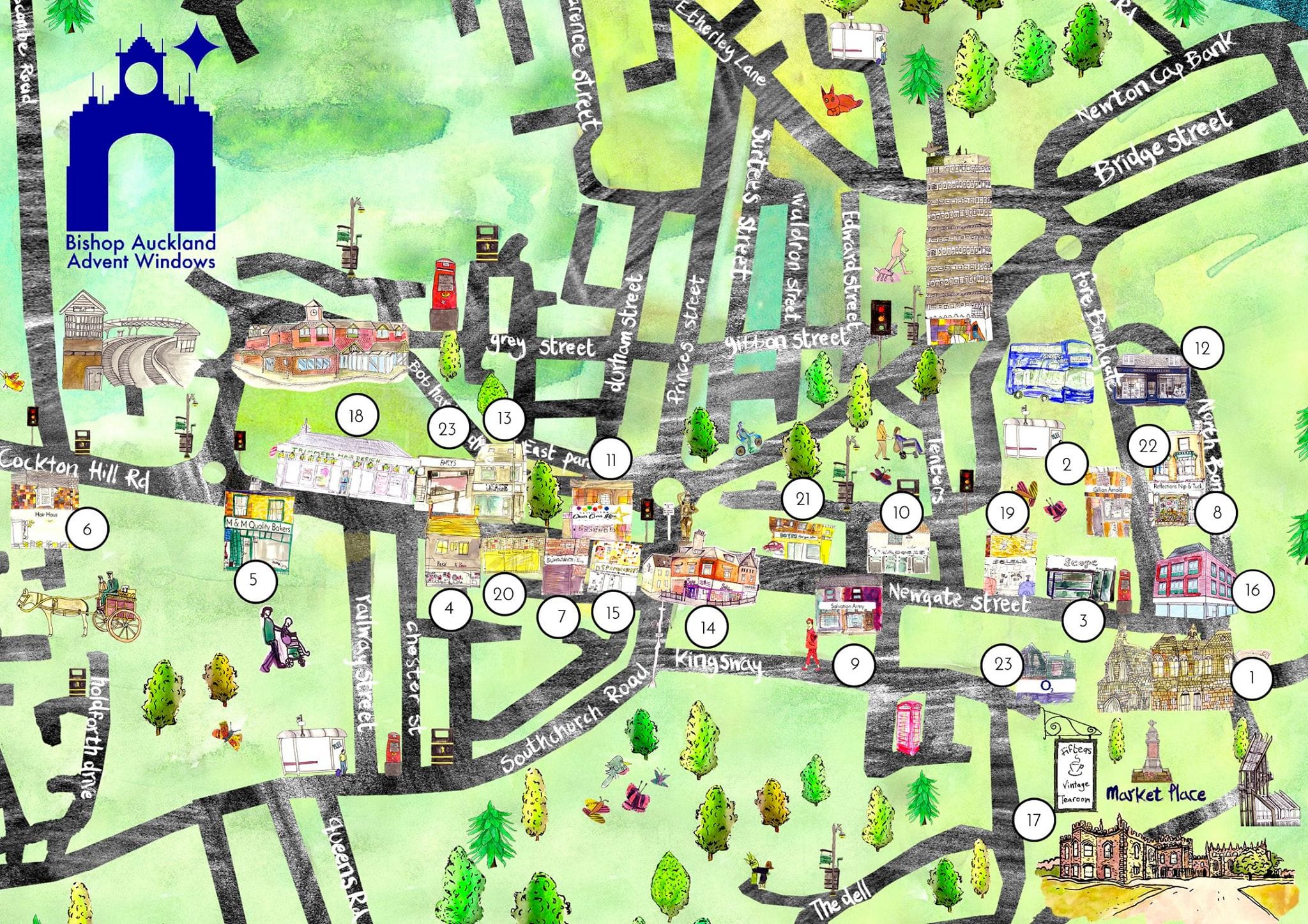 This large-scale map project in Bishop Auckland united people across the community—from school children and disadvantaged groups to local residents—through art workshops that captured the town’s landmarks, architecture, and notable figures. Hundreds of individual artworks were digitised and printed into a vibrant tapestry, delivered to every household in the bishop Auckland area. Its public unveiling in a local retail space sparked conversation and pride, and subsequent use by the Bishop Auckland Town Team, Advent Windows Trail, Northern Heartlands Heritage Trail, and Bishop Auckland Town Hall ensured the map remained a touchstone of communal identity.