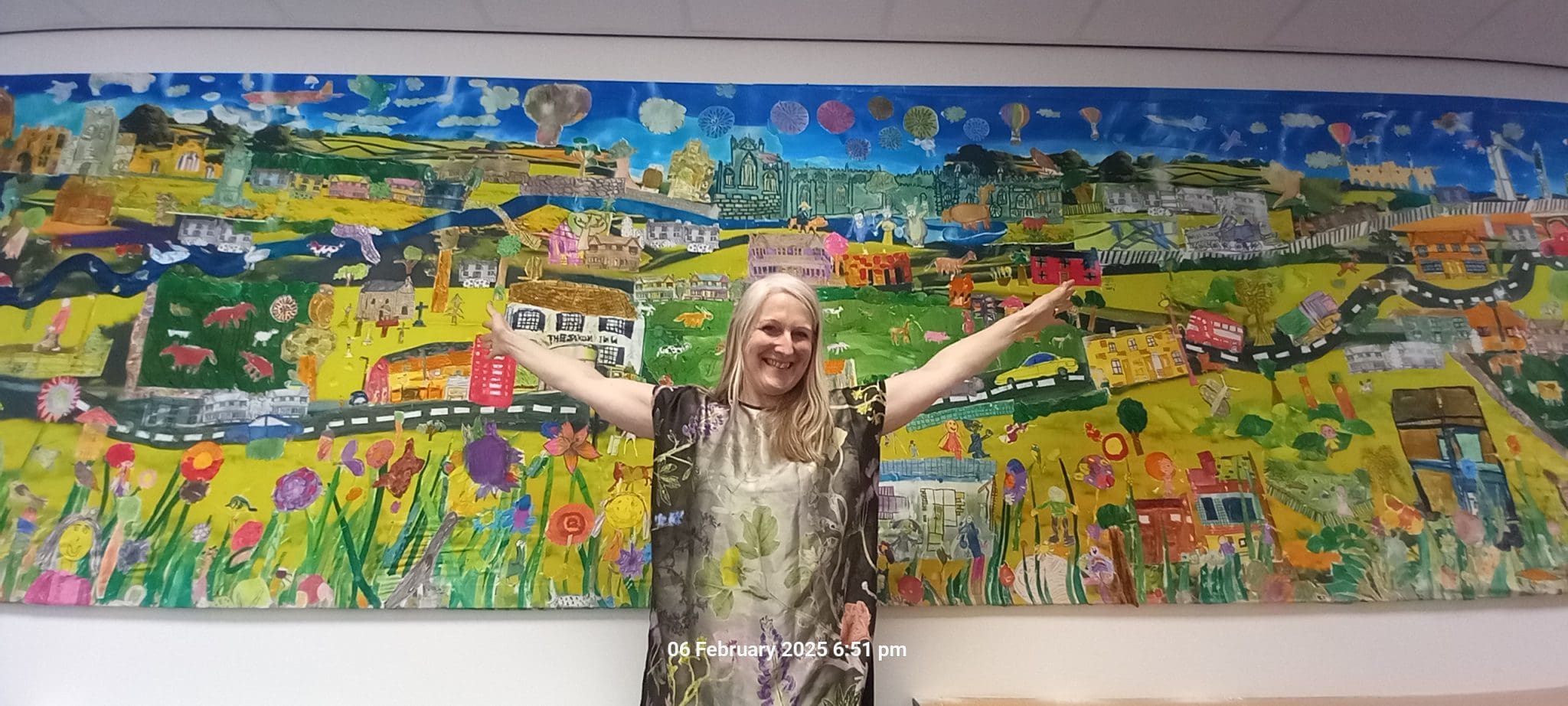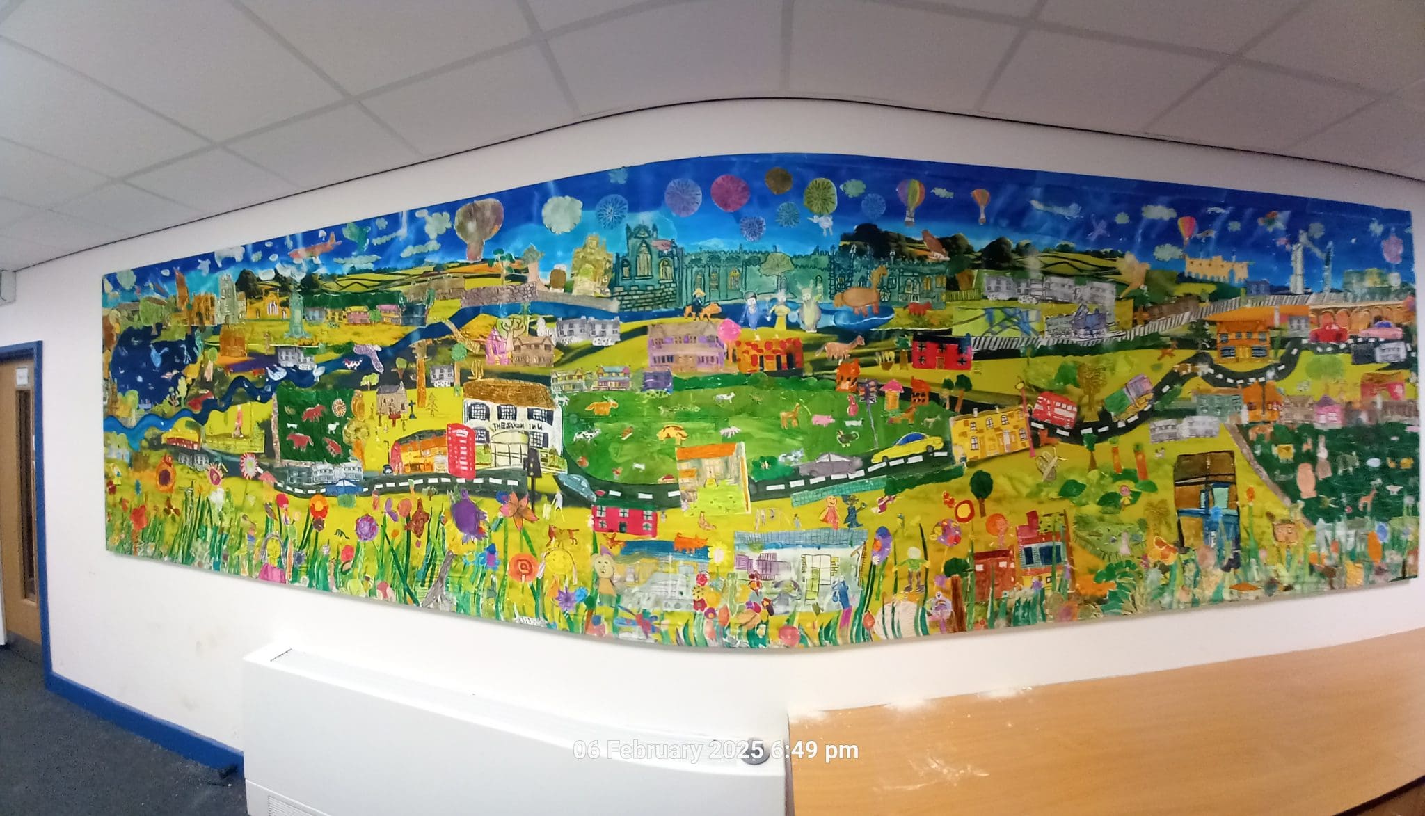 Escomb Primary School’s most recent project, created by Gillian and installed in February 2025, involved a full day of collaboration with each year group. Under Gillian’s guidance, students designed and crafted individual pieces representing their local and surrounding area. These elements were then combined to form a striking six-metre-wide wall hanging, which now takes pride of place in the new building’s main entrance hall.
