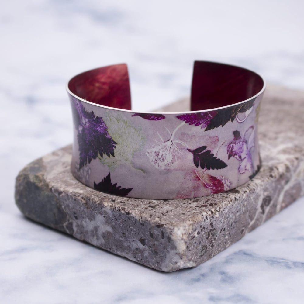 My cuff bracelets are uniquely designed to ensure your wrist will look fabulous all year round. Inspired by the nature around me, I handpicked British wildflowers to create my botanical Autumn Flurry design. My aluminium cuffs are printed with my design, then shaped into an anticlastic form by hand.