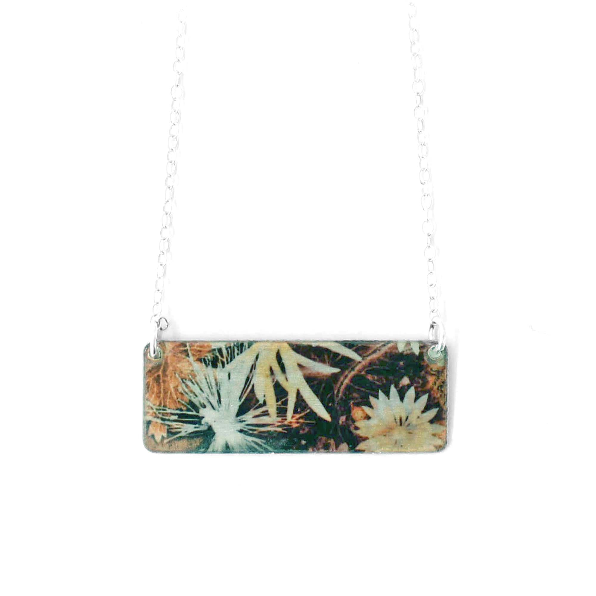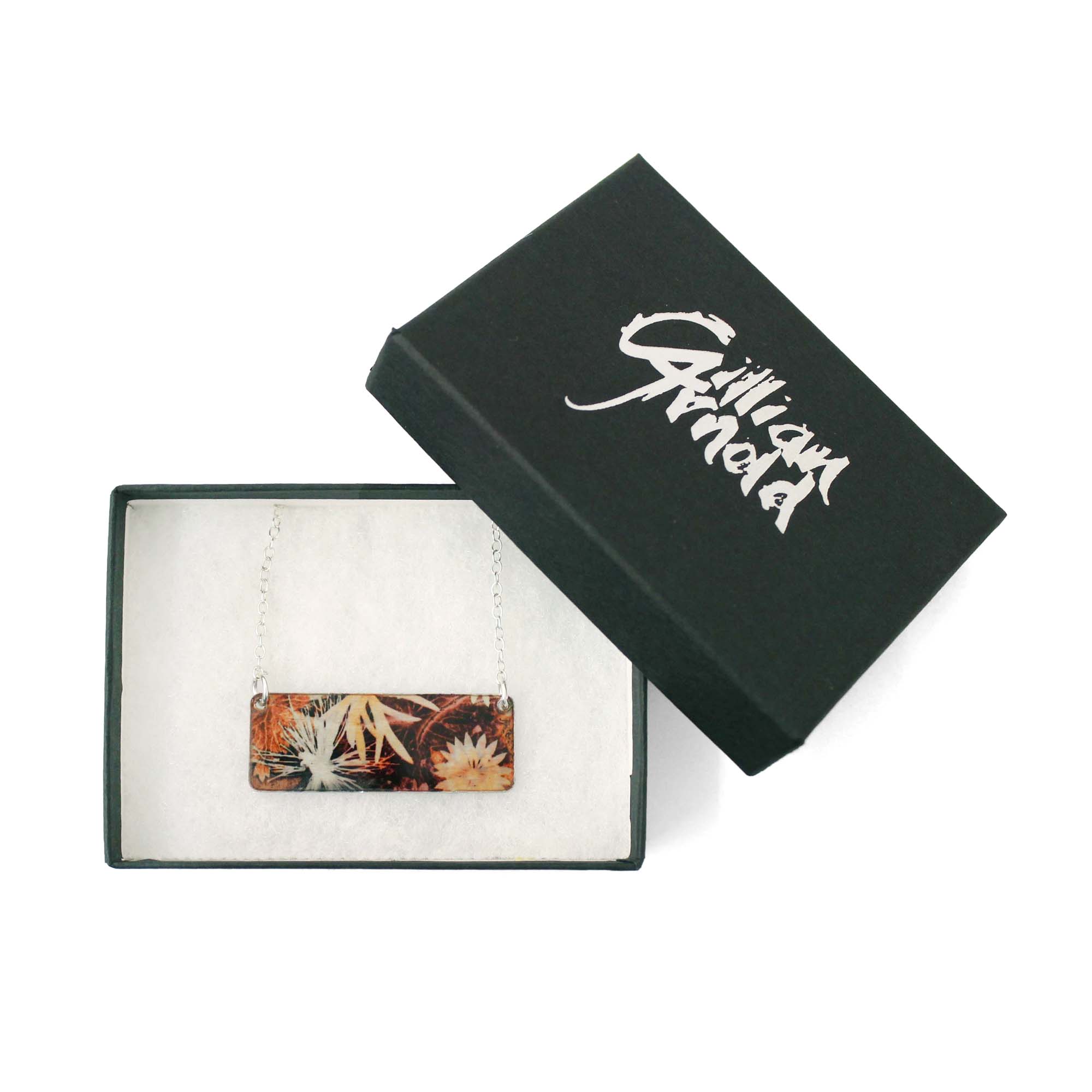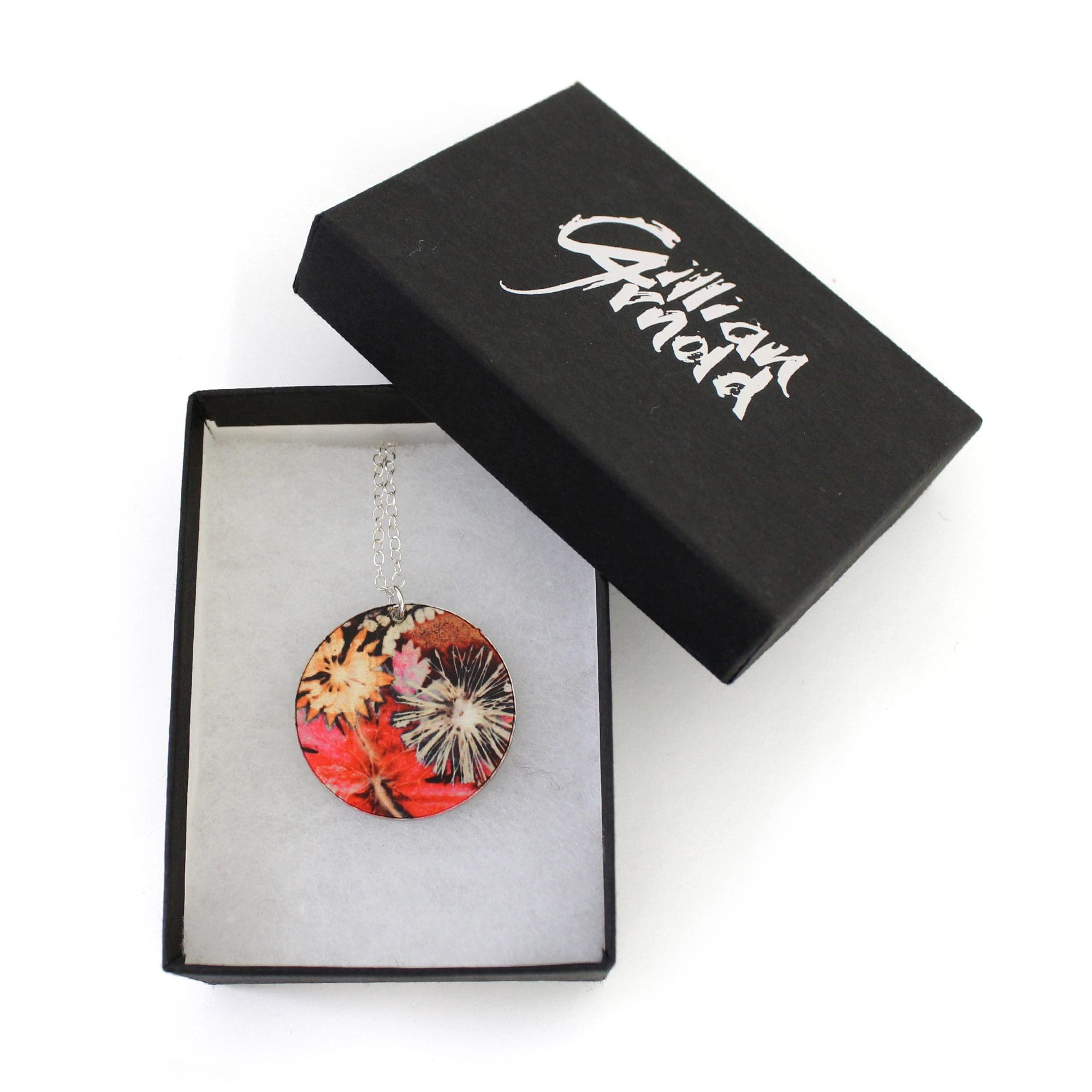This vibrant botanical design reflects beautifully along these handmade necklaces. My Autumn Burst print incorporates a pretty background with a trail of colourful flowers printed across the design.