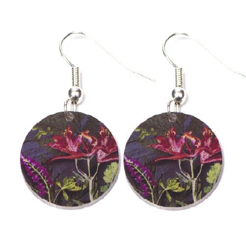 This botanical design reflects beautifully along these handmade round earrings. My Midnight Bloom print incorporates a lively and eye catching dark background with a trail of vibrant flowers printed across the design.