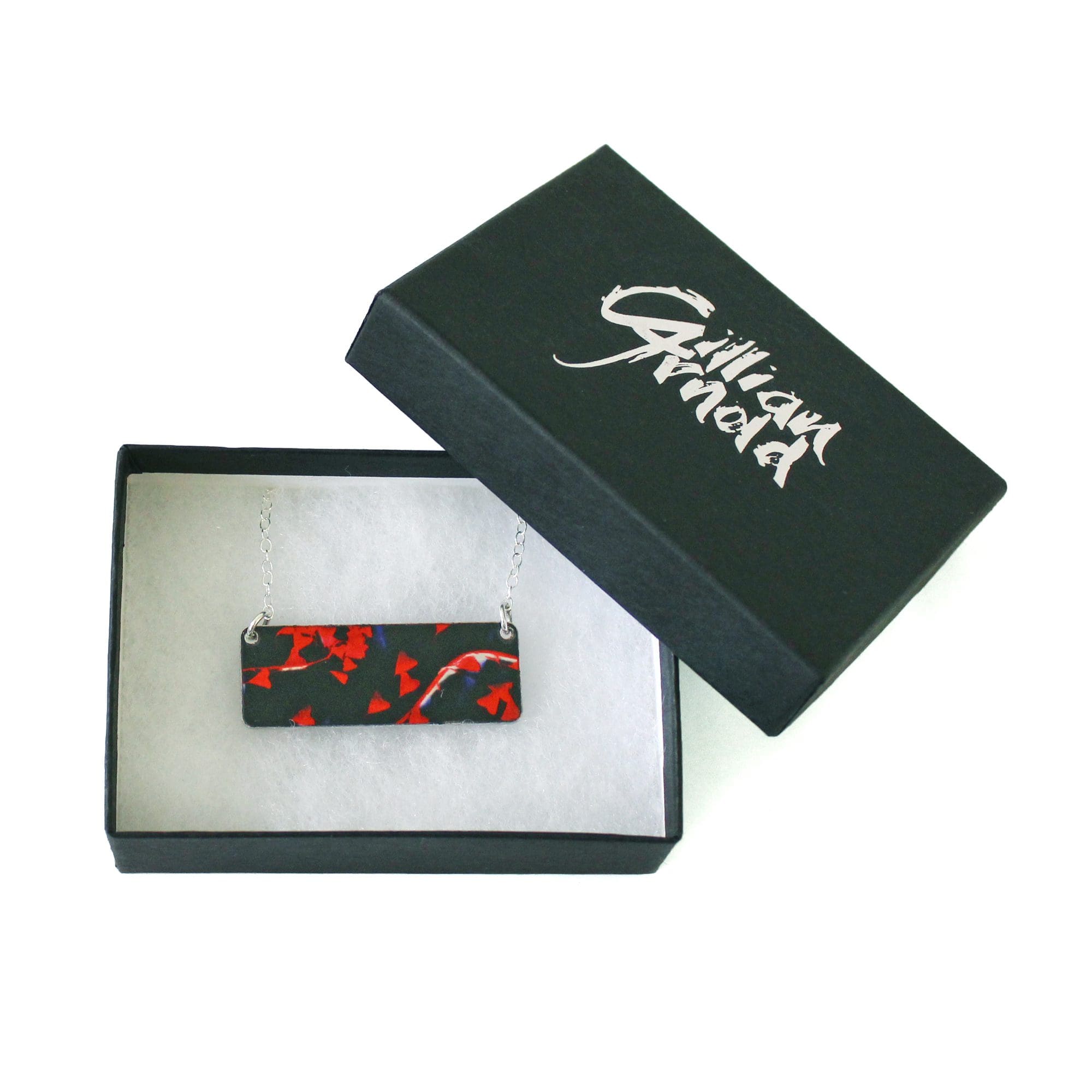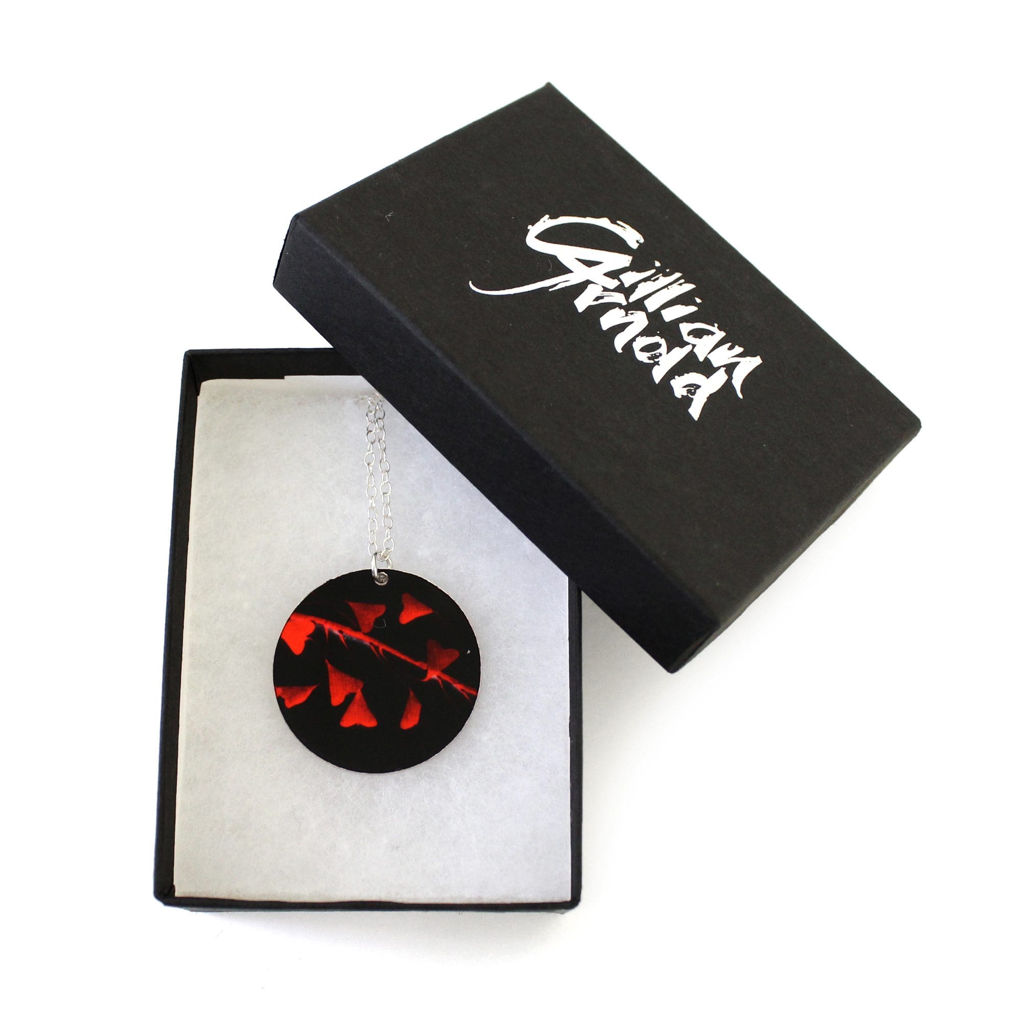 The dark and romantic contrasting tones of this pendant necklace illuminate the red heart shaped leaves on this cuff as they dance across the darkened background. This pendant is a 3cm disc hanging from a 16.5 inch sterling silver chain.