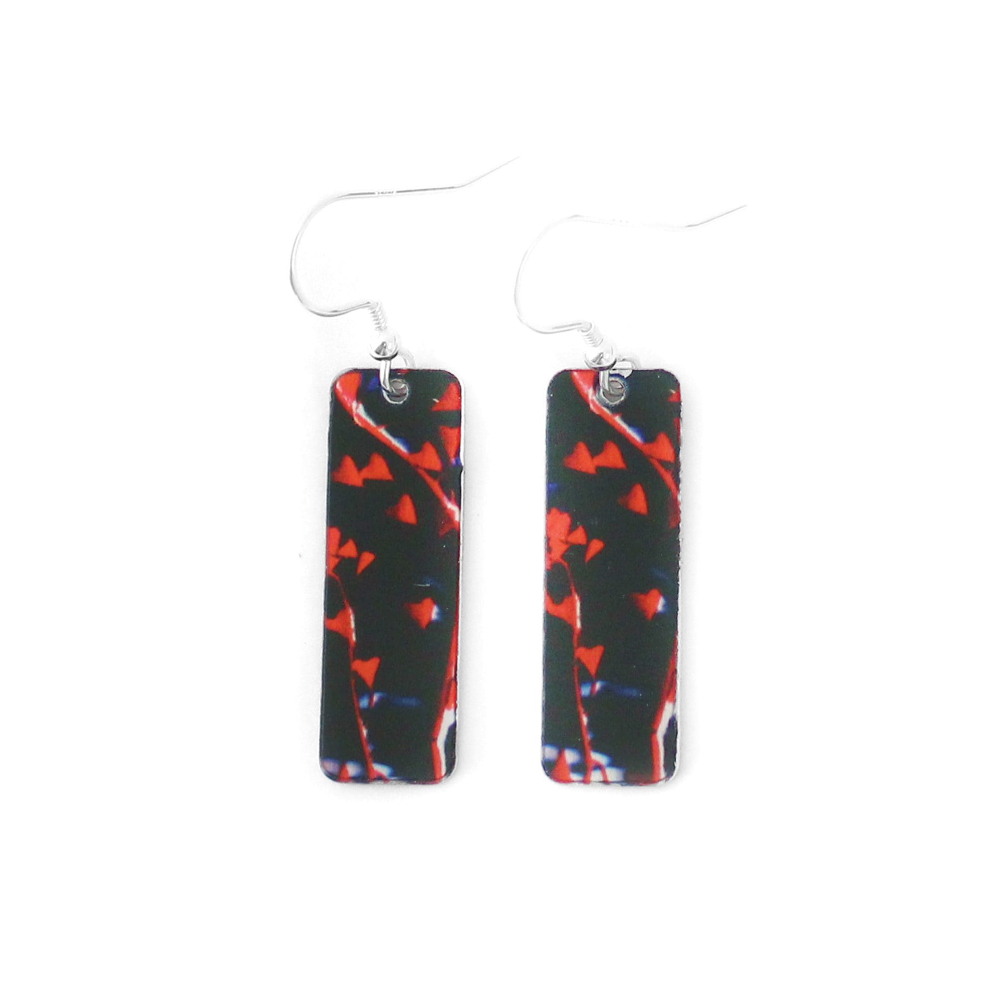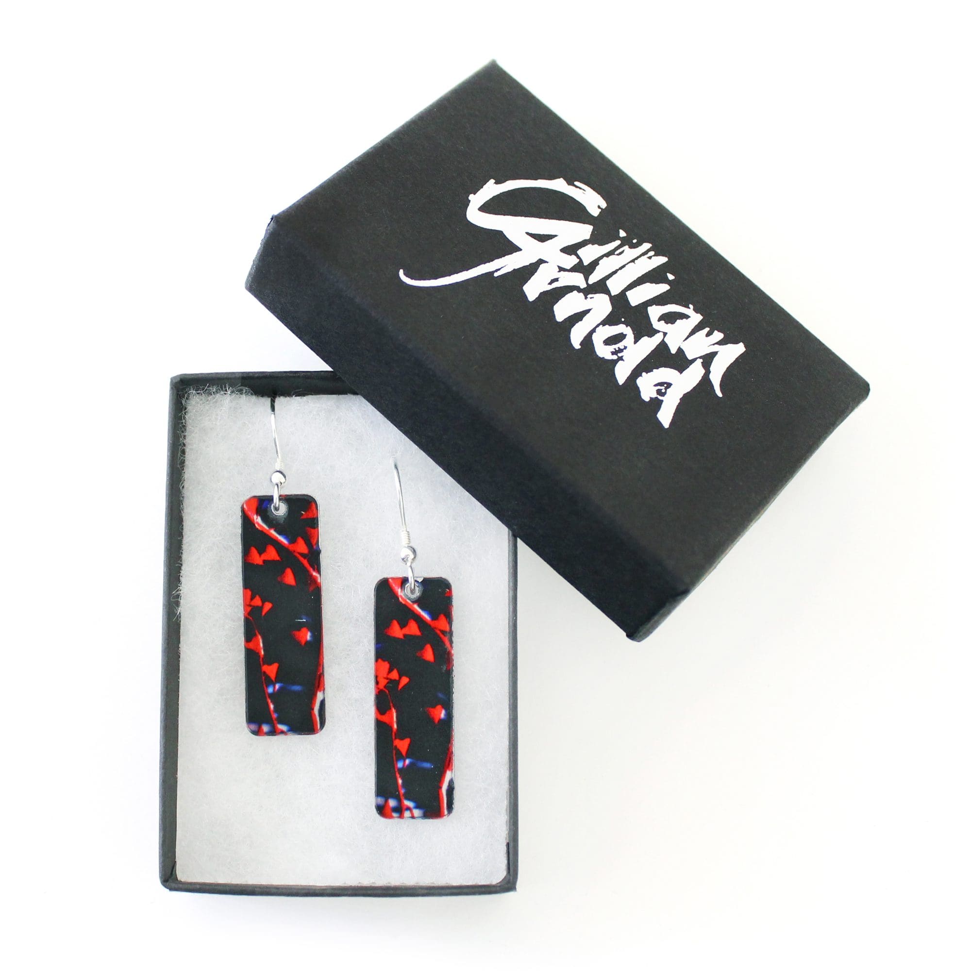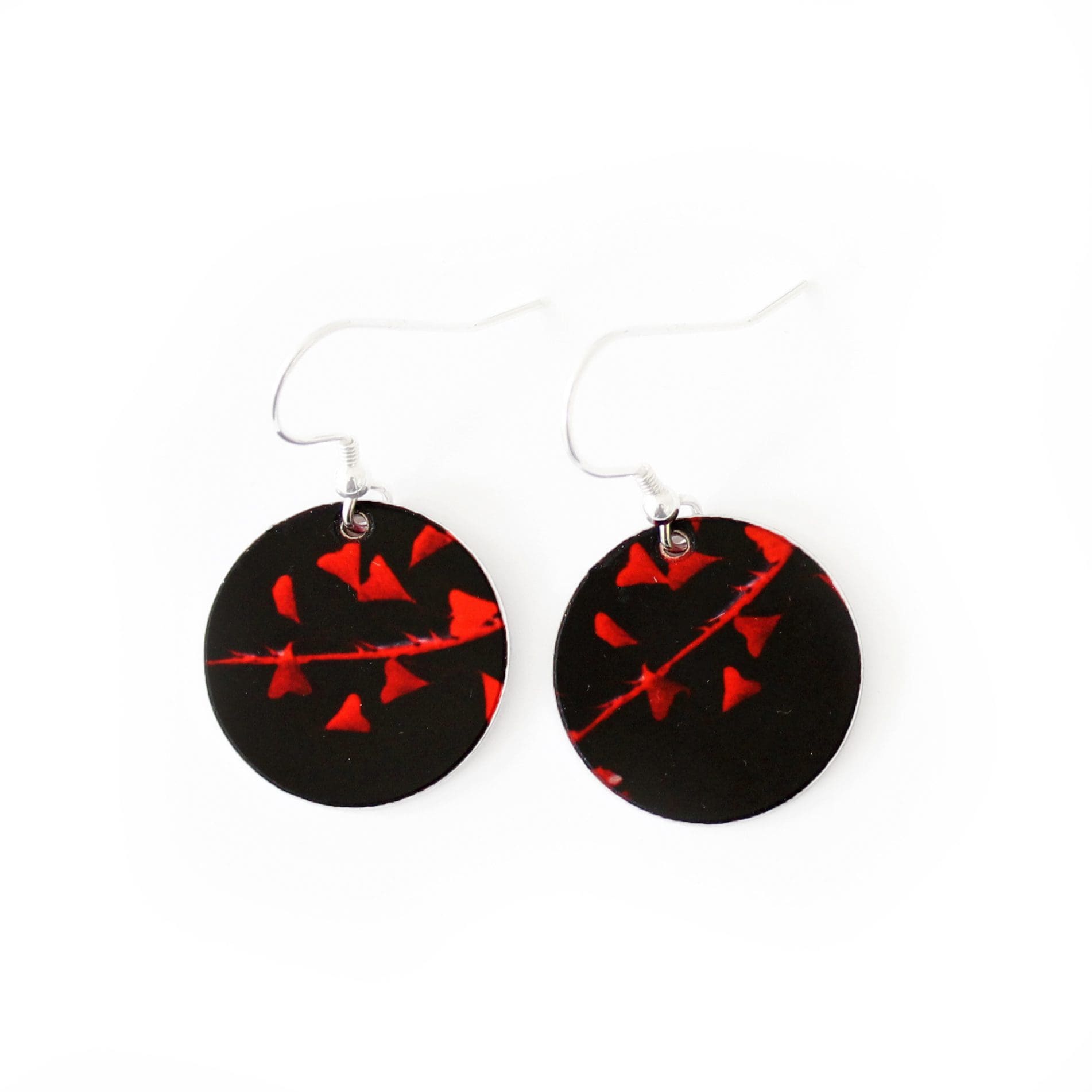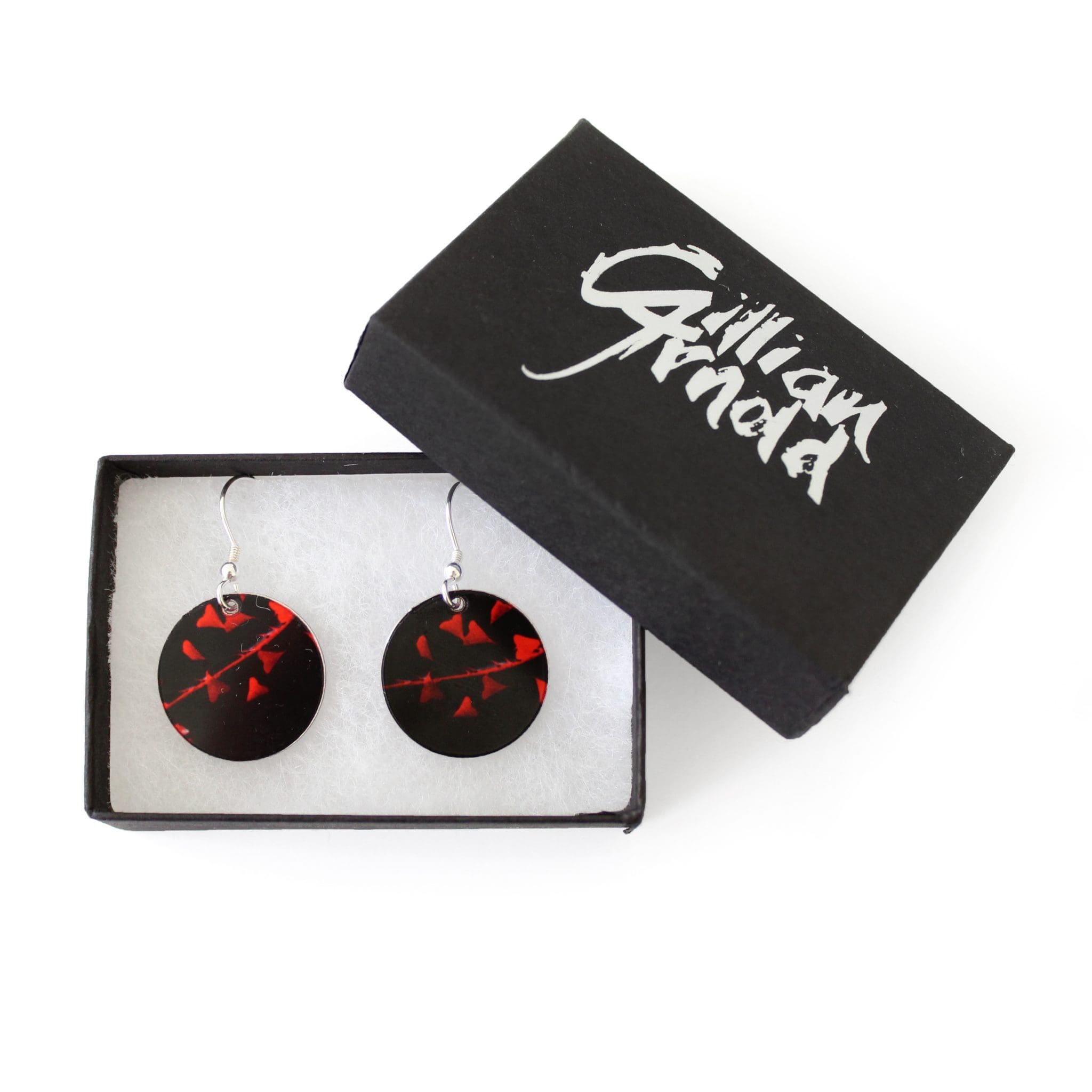 The dark and romantic contrasting tones of this round earring design illuminate the red heart shaped leaves on this cuff as they dance across the darkened background. Pair of 2cm aluminium disc earrings, with solid sterling silver wire loop, complete in black card gift box.