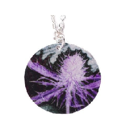 This vibrant botanical design reflects beautifully along these handmade necklaces. My Purple Thistle print incorporates a pretty background with a trail of colourful flowers printed across the design.
