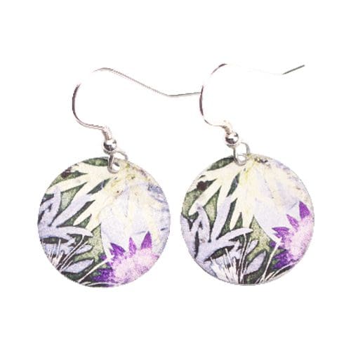 This vibrant botanical design reflects beautifully along these handmade round earrings. My Winter Moon print incorporates a lively and eye catching green background with a trail of colourful purple flowers printed across the design.