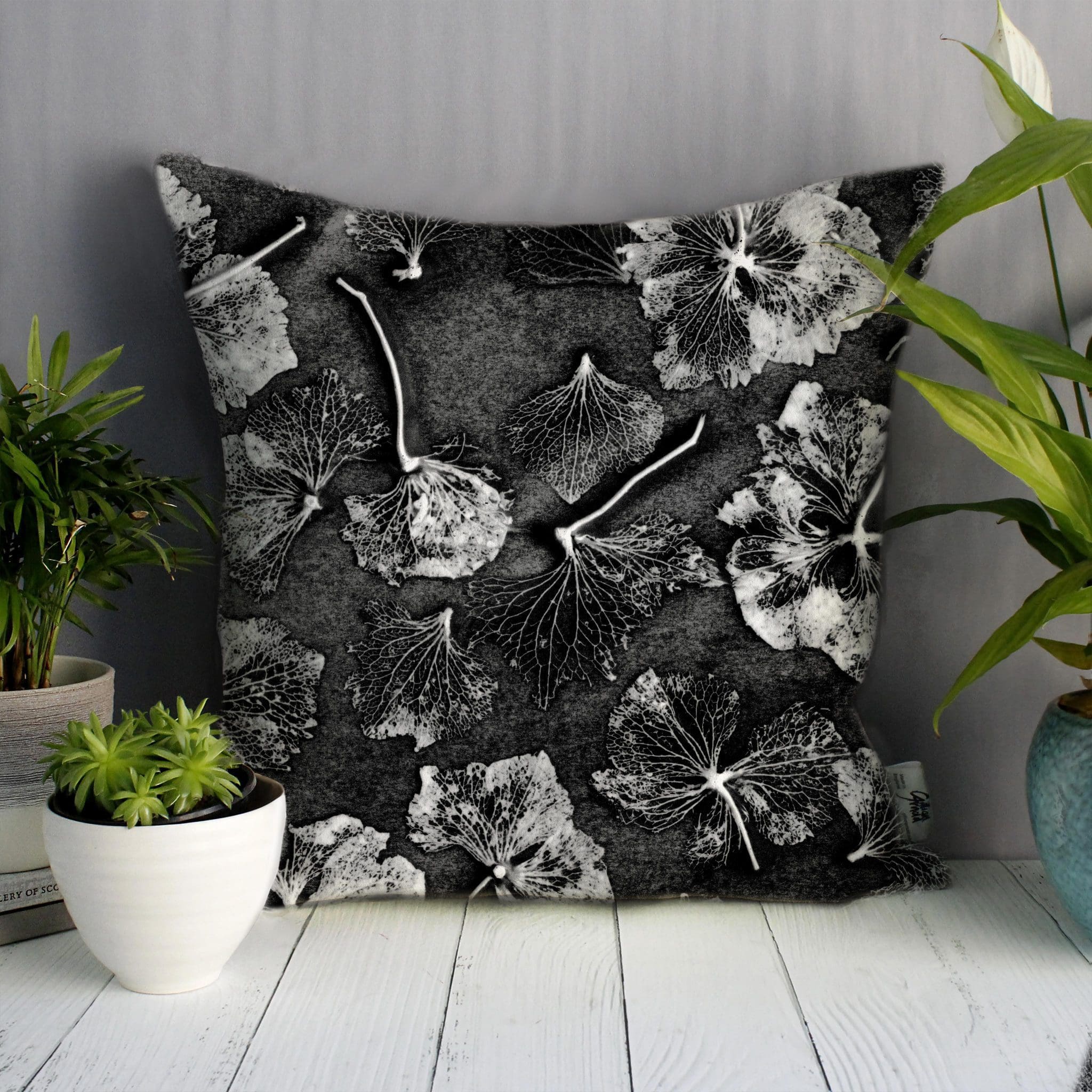 Hydrangea leaves create an etched line impression in this fascinating print. I carefully boiled the leaves of the hydrangea to bring this design into fruition, which is a collage of fading natural exoskeletons and bold stems. The sharp white contrast of the hydrangea’s on the dark cushion allows for a shadow like effect, an eye catching and attractive piece of home décor.