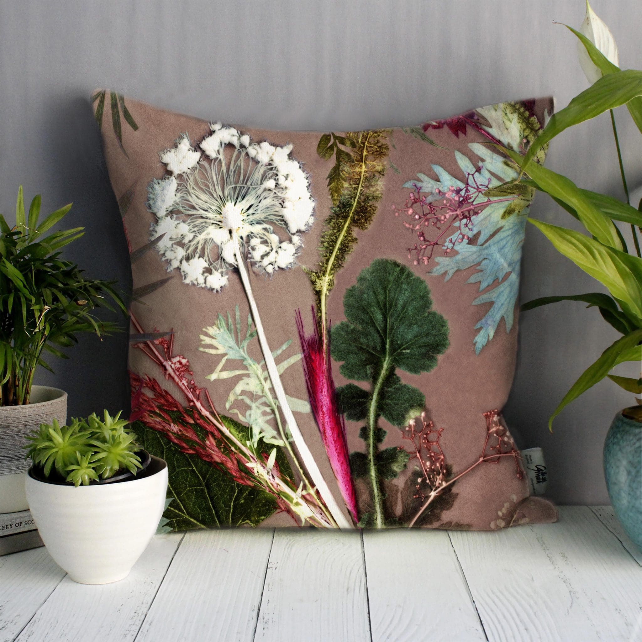 A subtle but enticing pink and green sofa cushion with a calming country aesthetic and a striking central motif in the pattern, featuring a unique botanical design created by artist Gillian Arnold and handmade to order in Darlington, UK.