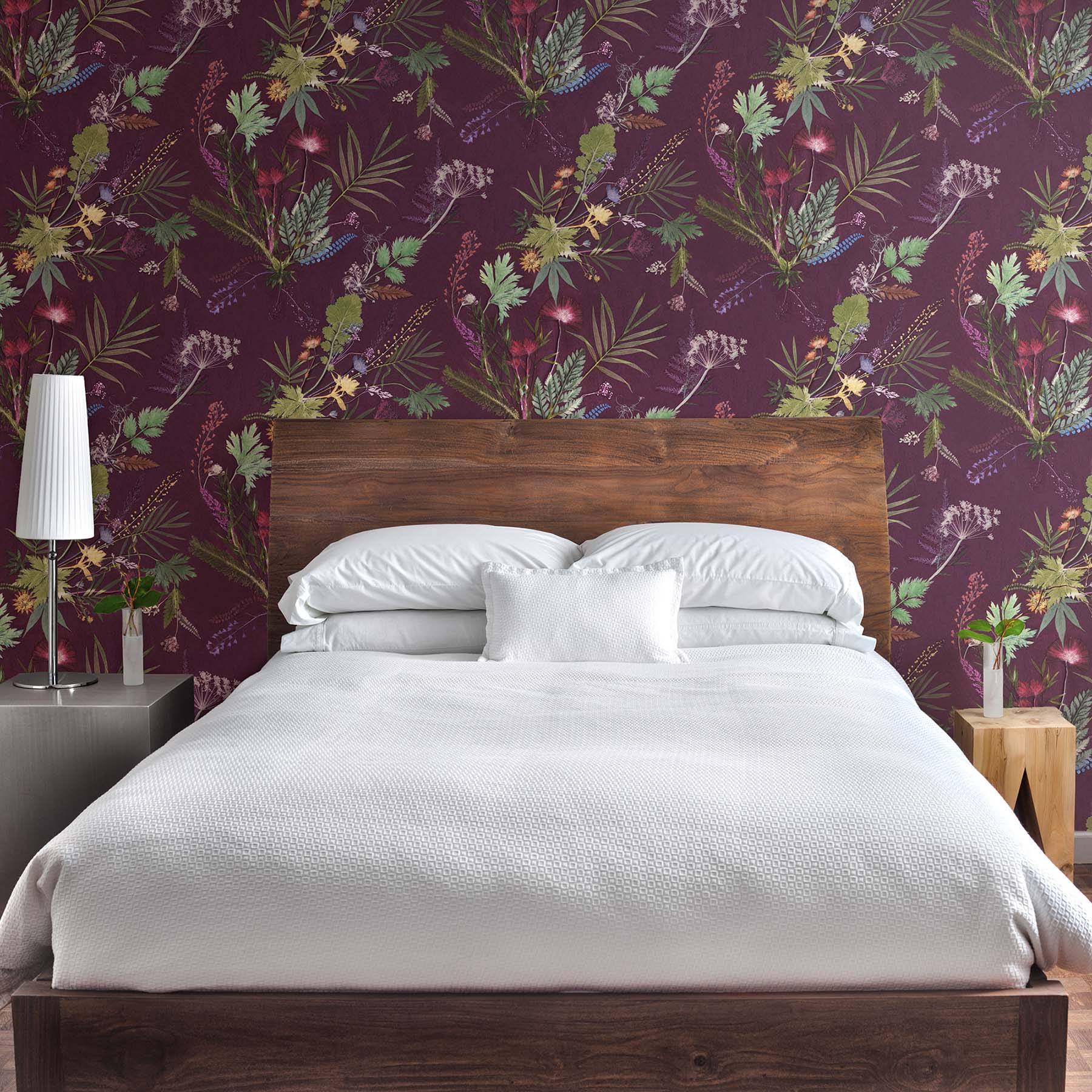 My unique floral wallpaper is perfect for creating beautiful feature walls or vibrant and exotic rooms in your house. My Tropical Wine wallpaper print is designed with handpicked British wildflowers that I have picked myself, to make your wallpaper.